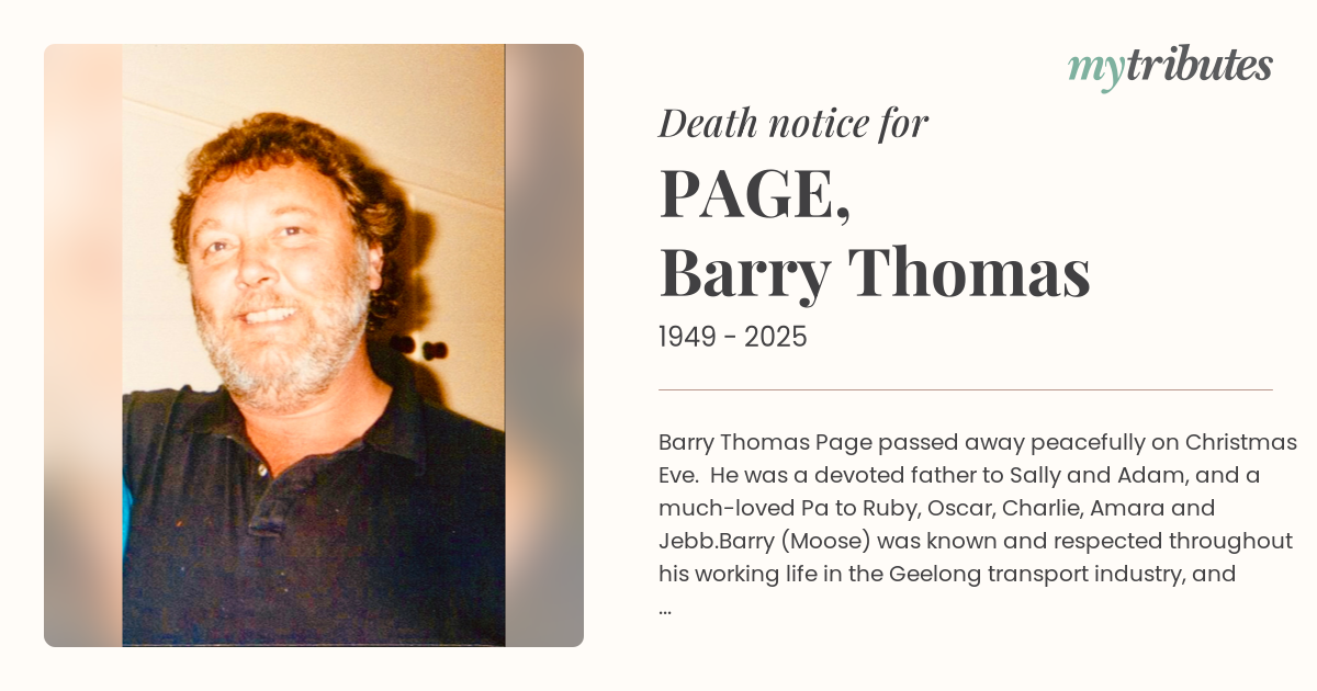 12°CBarry Thomas Page passed away peacefully on Christmas Eve. He was a devoted father to Sally and Adam, and a much-loved Pa to Ruby, Oscar, Charlie, Amara and Jebb.