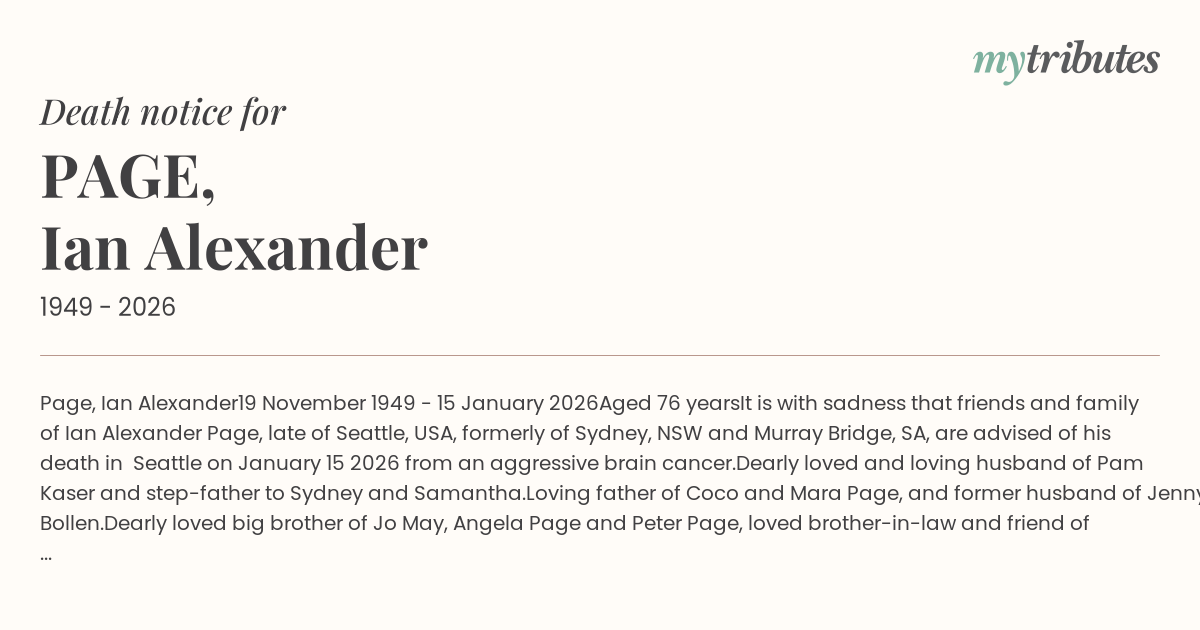 It is with sadness that friends and family of Ian Alexander Page, late of Seattle, USA, formerly of Sydney, NSW and Murray Bridge, SA, are advised of his death in Seattle on January 15 2026 from an aggressive brain cancer.