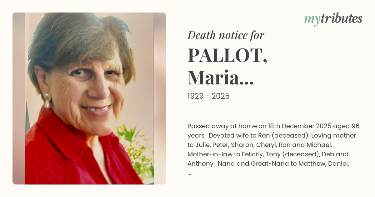 Nana and Great-Nana to Matthew, Daniel, Carly, Laura, Alex, Jake, Jamie, Andrew (deceased), Allanah, Tahlia, Lucas, Thomas, William, Marina, Tessa, Sophia, Cruz, Sari, Annie and Elliot.