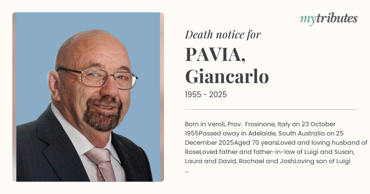 To my beloved son Giancarlo. You suffered far too much and have been taken from us far too soon. Thankyou for the love, happiness and care you gave me throughout your whole life. To have you as a son has truly been a blessing. I am sure you mother feels the same. Your courage, strength and care for others has been inspirational. Even at a time when your own health was failing your main concern was the health and welfare of me and the others around you ahead of yourself. You will always be loved, cherished and remembered. May you find eternal peace. Your forever grateful and proud parents. Our eternal love. Luigi and Olga Pavia