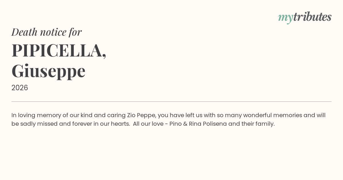 12°CIn loving memory of our kind and caring Zio Peppe, you have left us with so many wonderful memories and will be sadly missed and forever in our hearts. All our love - Pino & Rina Polisena and their family.