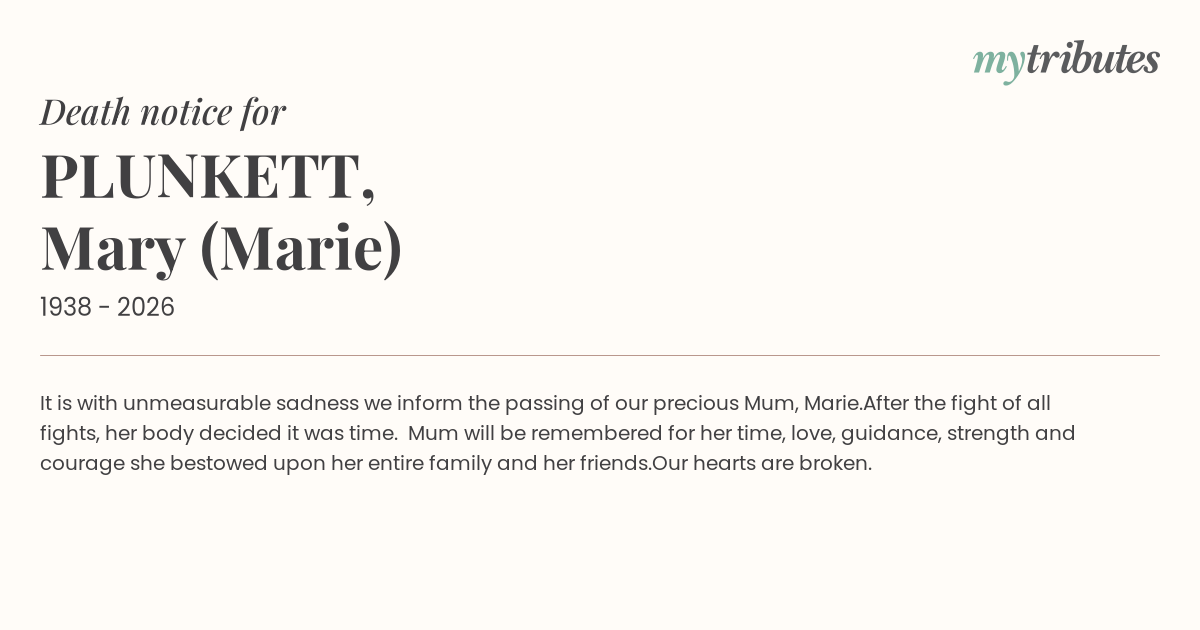 12°CIt is with unmeasurable sadness we inform the passing of our precious Mum, Marie.
