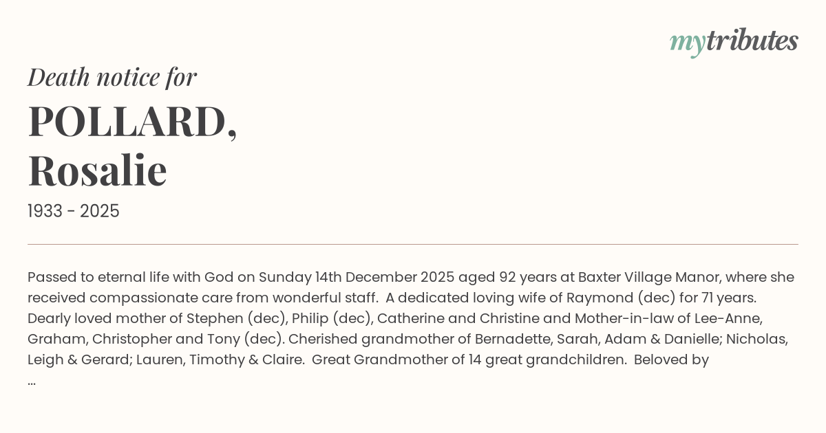 12°CPassed to eternal life with God on Sunday 14th December 2025 aged 92 years at Baxter Village Manor, where she received compassionate care from wonderful staff. A dedicated loving wife of Raymond (dec) for 71 years. Dearly loved mother of Stephen (dec), Philip (dec), Catherine and Christine and Mother-in-law of Lee-Anne, Graham, Christopher and Tony (dec). Cherished grandmother of Bernadette, Sarah, Adam & Danielle; Nicholas, Leigh & Gerard; Lauren, Timothy & Claire. Great Grandmother of 14 great grandchildren. Beloved by all of her family and friends. She will be sadly missed. Forever In Our Hearts.