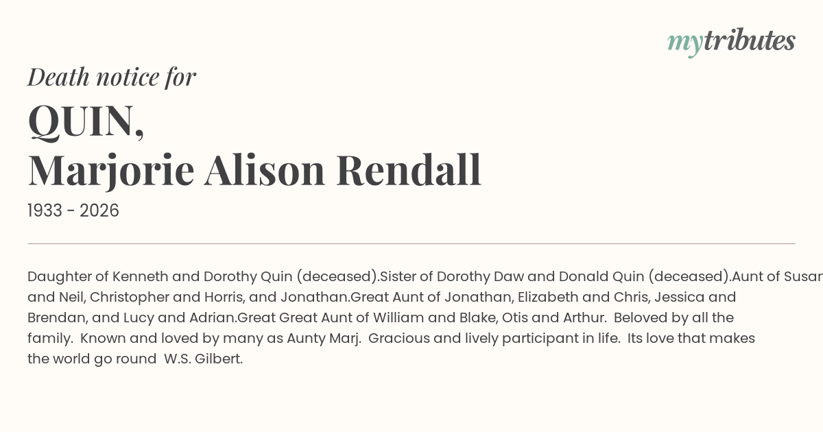 12°CDaughter of Kenneth and Dorothy Quin (deceased).