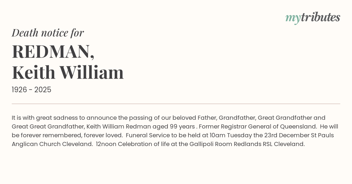12°CIt is with great sadness to announce the passing of our beloved Father, Grandfather, Great Grandfather and Great Great Grandfather, Keith William Redman aged 99 years . Former Registrar General of Queensland. He will be forever remembered, forever loved.
