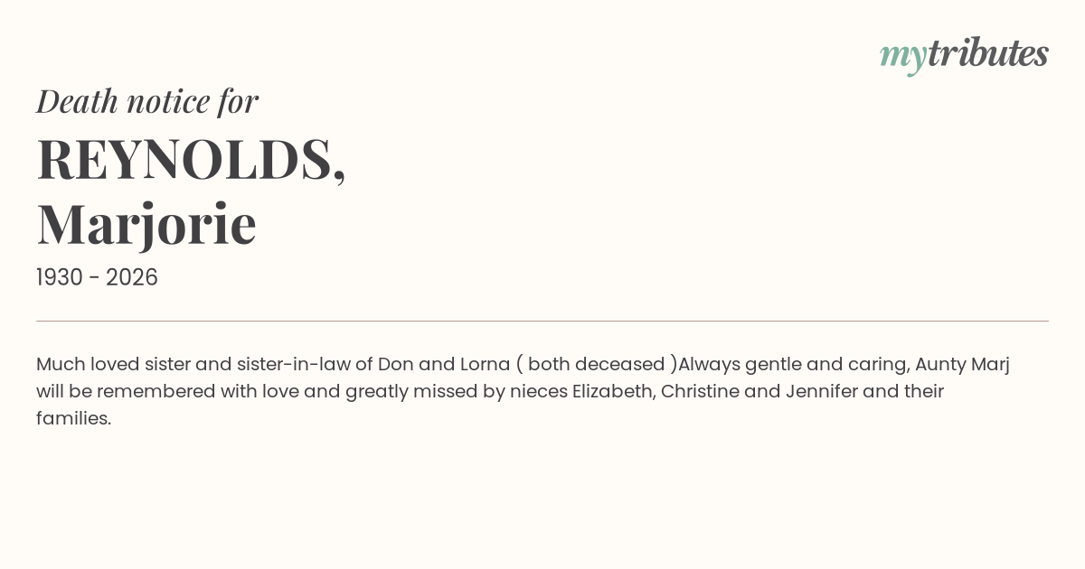 Always gentle and caring, Aunty Marj will be remembered with love and greatly missed by nieces Elizabeth, Christine and Jennifer and their families.