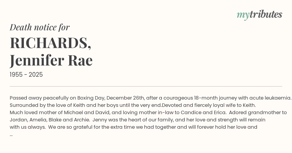 Devoted and fiercely loyal wife to Keith. Much loved mother of Michael and David, and loving mother in-law to Candice and Erica. Adored grandmother to Jordan, Amelia, Blake and Archie.