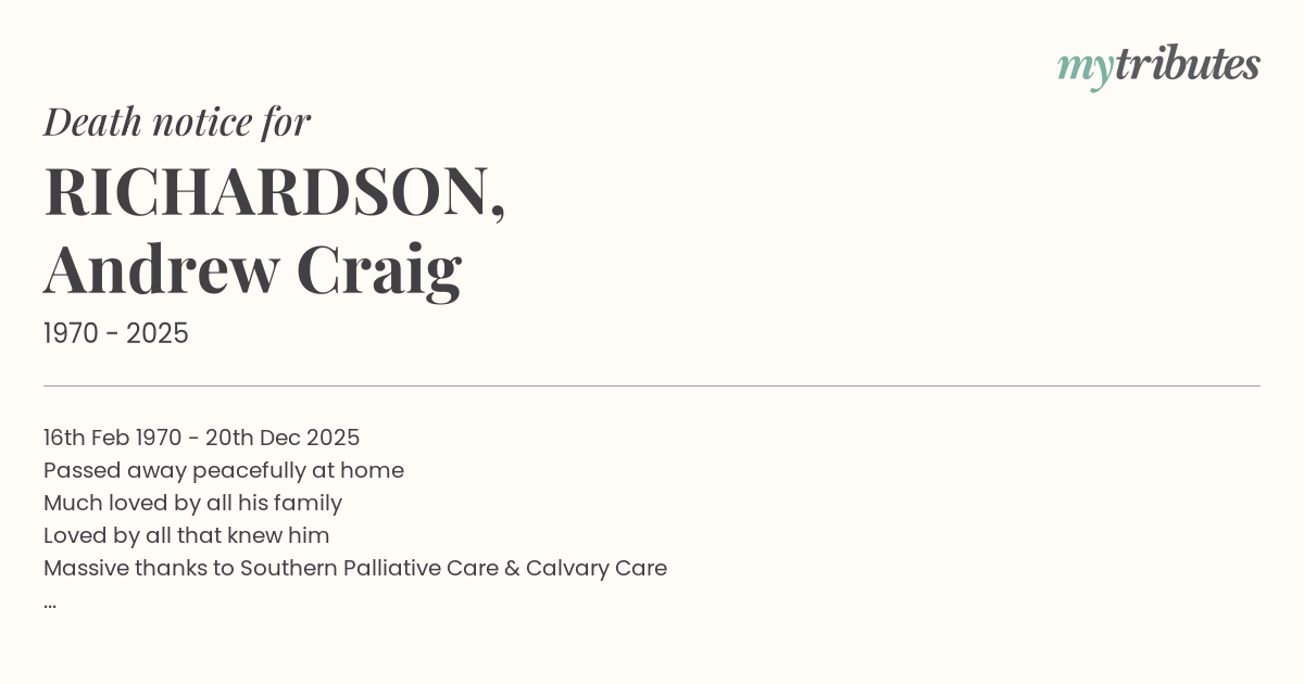 12°C16th Feb 1970 - 20th Dec 2025 Passed away peacefully at home Much loved by all his family Loved by all that knew him Massive thanks to Southern Palliative Care & Calvary Care You smoothed the journey He'll be much missed.