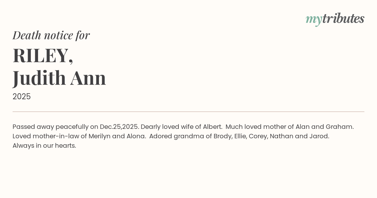 12°CPassed away peacefully on Dec.25,2025. Dearly loved wife of Albert. Much loved mother of Alan and Graham.