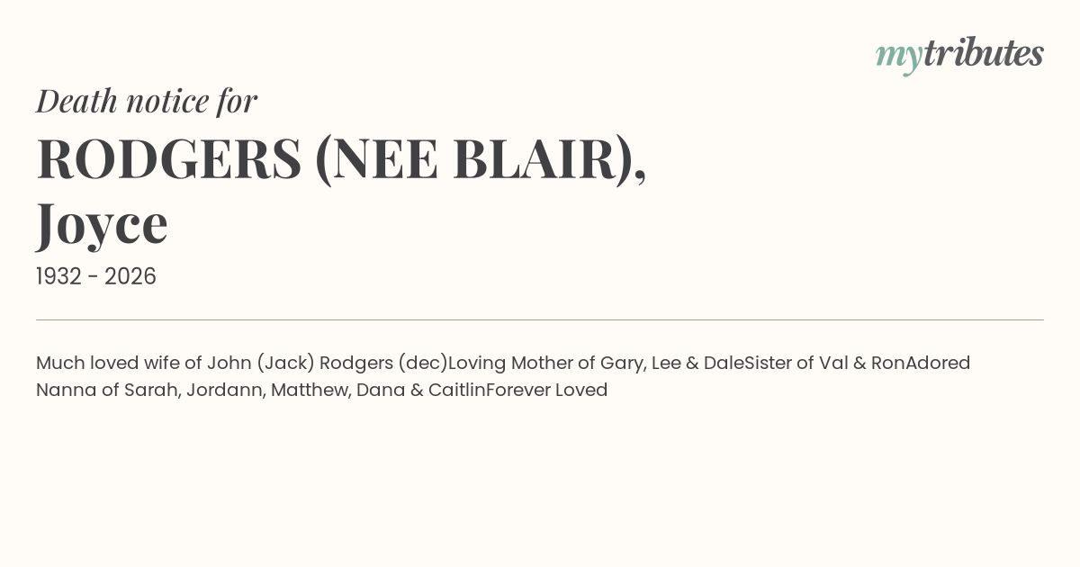 12°CMuch loved wife of John (Jack) Rodgers (dec)