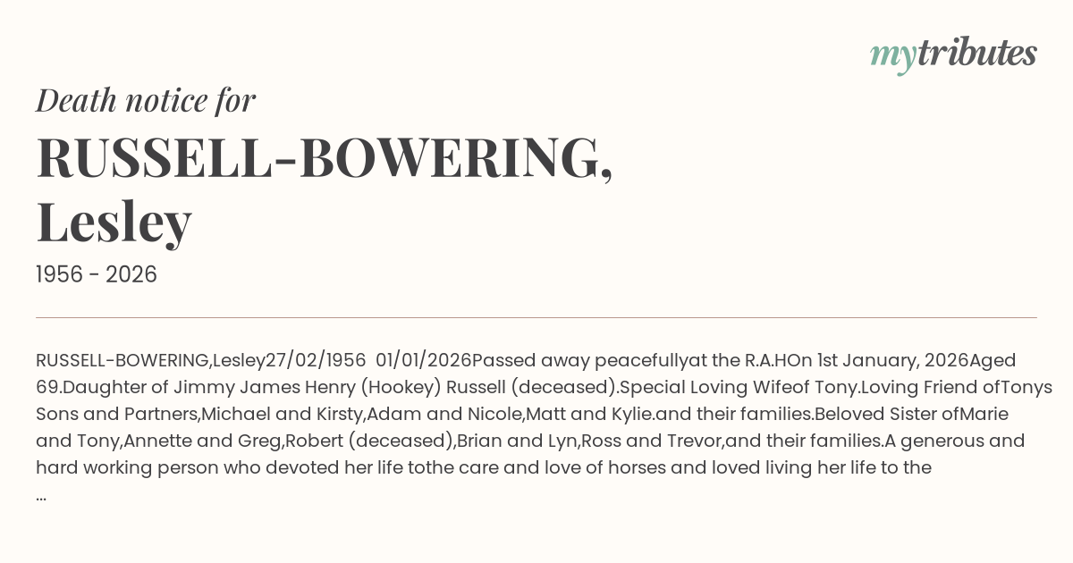 Daughter of Jimmy James Henry (Hookey) Russell (deceased).