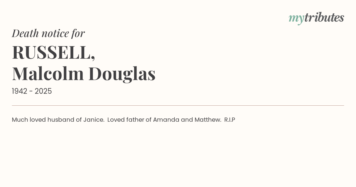 12°CMuch loved husband of Janice. Loved father of Amanda and Matthew. R.I.P