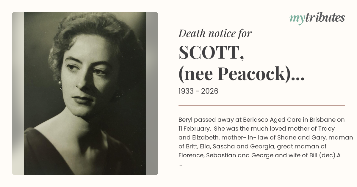 12°CBeryl passed away at Berlasco Aged Care in Brisbane on 11 February. She was the much loved mother of Tracy and Elizabeth, mother- in- law of Shane and Gary, maman of Britt, Ella, Sascha and Georgia, great maman of Florence, Sebastian and George and wife of Bill (dec).