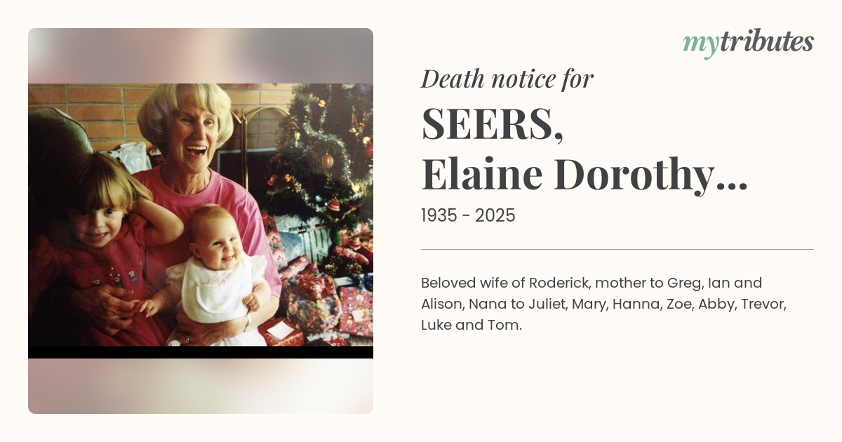 12°CBeloved wife of Roderick, mother to Greg, Ian and Alison, Nana to Juliet, Mary, Hanna, Zoe, Abby, Trevor, Luke and Tom.