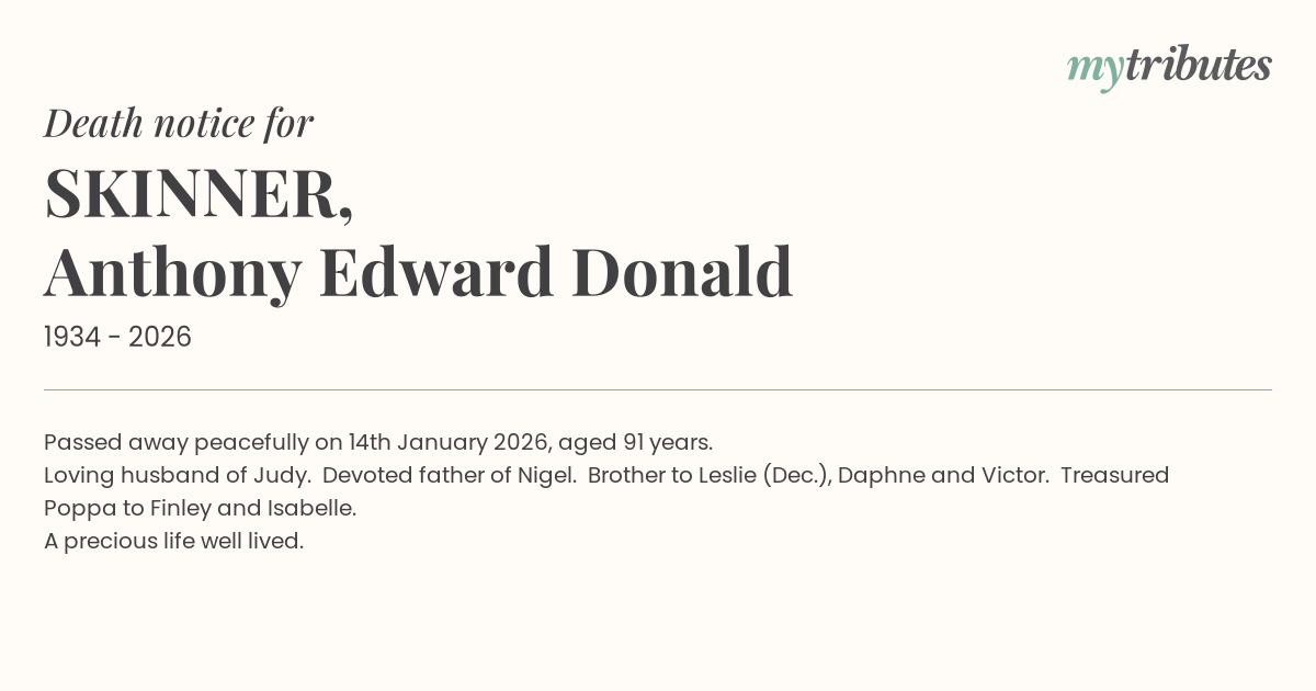 12°CPassed away peacefully on 14th January 2026, aged 91 years.