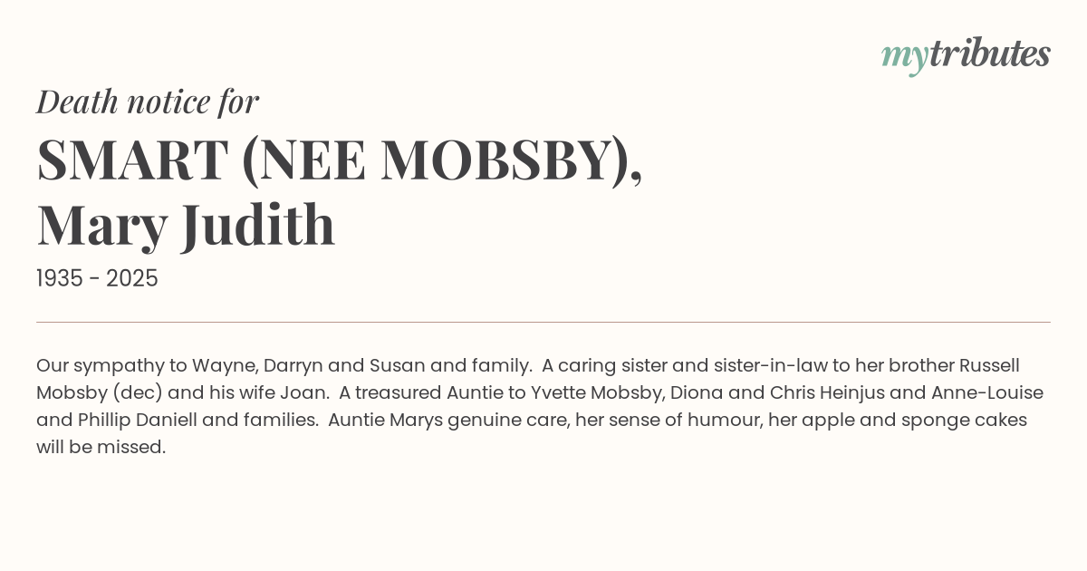 A treasured Auntie to Yvette Mobsby, Diona and Chris Heinjus and Anne-Louise and Phillip Daniell and families.