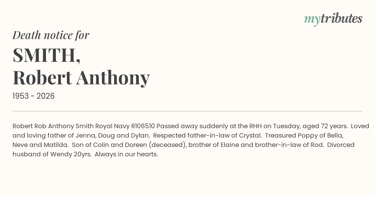 12°CRobert “Rob” Anthony Smith Royal Navy R106510 Passed away suddenly at the RHH on Tuesday, aged 72 years. Loved and loving father of Jenna, Doug and Dylan. Respected father-in-law of Crystal. Treasured Poppy of Bella, Neve and Matilda. Son of Colin and Doreen (deceased), brother of Elaine and brother-in-law of Rod. Divorced husband of Wendy 20yrs. Always in our hearts.