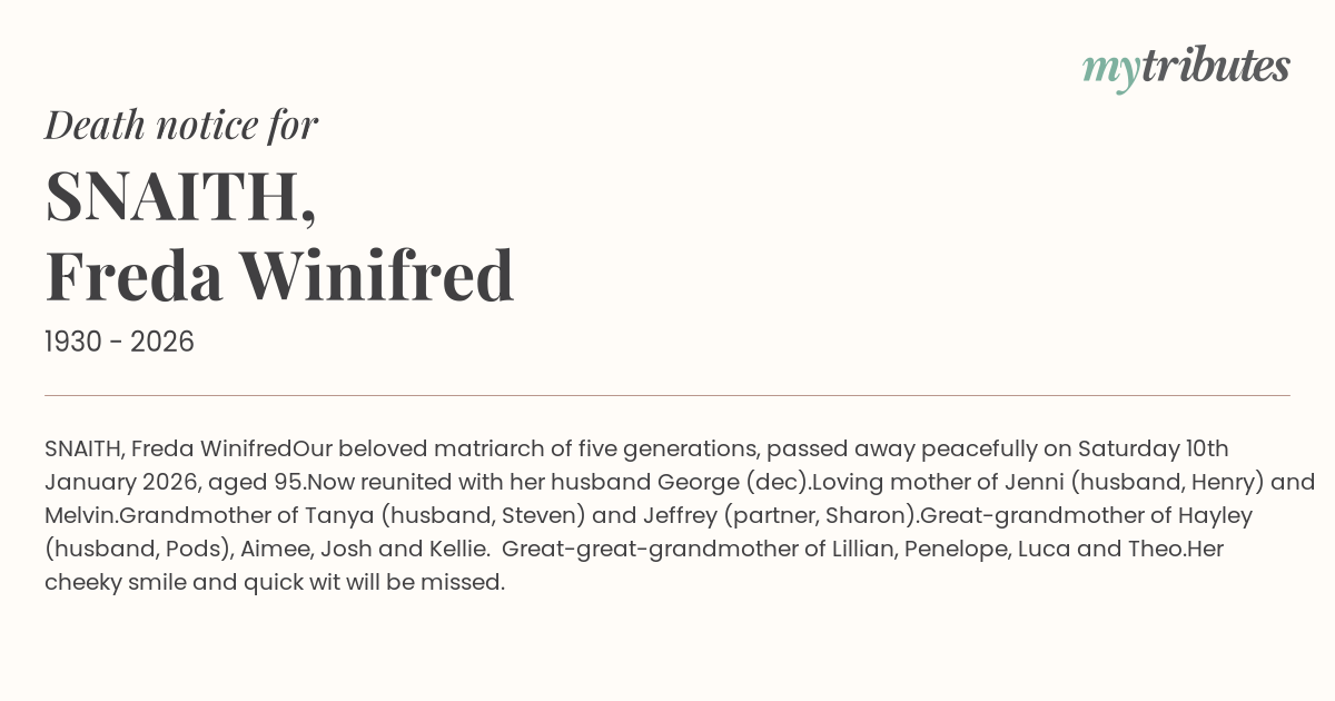 Our beloved matriarch of five generations, passed away peacefully on Saturday 10th January 2026, aged 95.