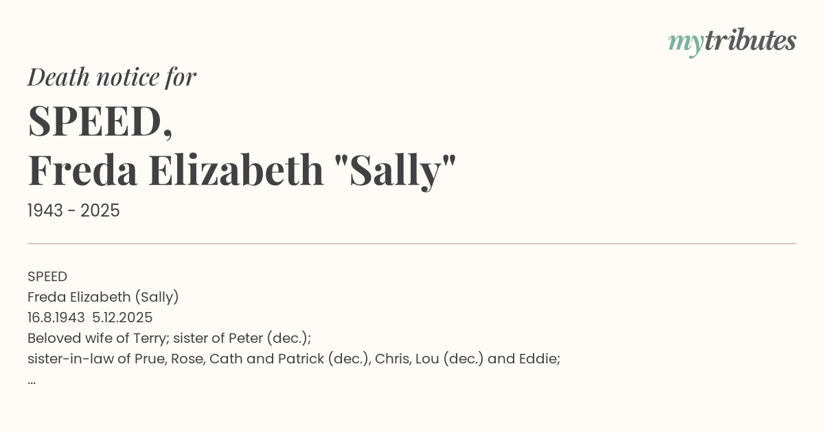 12°CSPEED Freda Elizabeth (Sally) 16.8.1943 – 5.12.2025 Beloved wife of Terry; sister of Peter (dec.); sister-in-law of Prue, Rose, Cath and Patrick (dec.), Chris, Lou (dec.) and Eddie; aunt of Raani, Noah (dec.), Sean, Gavin and Polly; Librarian, teacher, activist, archivist, friend and inspiration to many around Australia, the UK, the USA, and elsewhere