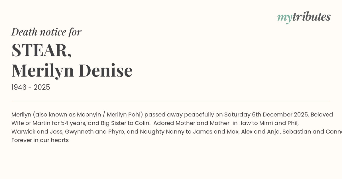 12°CMerilyn (also known as Moonyin / Merilyn Pohl) passed away peacefully on Saturday 6th December 2025. Beloved Wife of Martin for 54 years, and Big Sister to Colin. Adored Mother and Mother-in-law to Mimi and Phil, Warwick and Joss, Gwynneth and Phyro, and Naughty Nanny to James and Max, Alex and Anja, Sebastian and Connor. Forever in our hearts