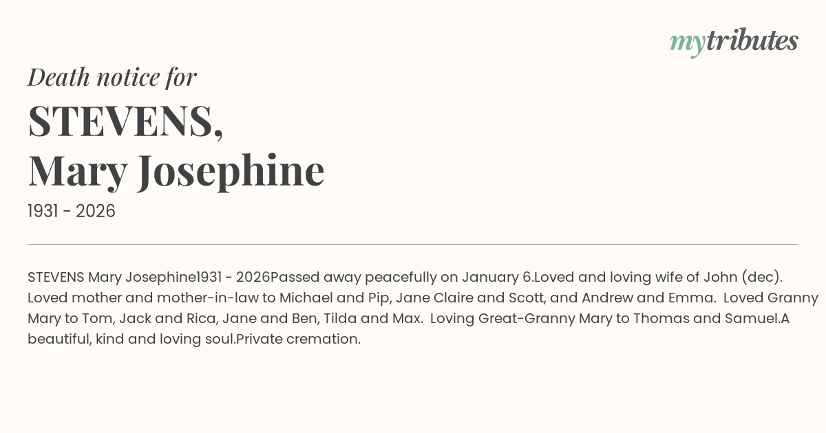 Loved and loving wife of John (dec). Loved mother and mother-in-law to Michael and Pip, Jane Claire and Scott, and Andrew and Emma. Loved Granny Mary to Tom, Jack and Rica, Jane and Ben, Tilda and Max. Loving Great-Granny Mary to Thomas and Samuel.