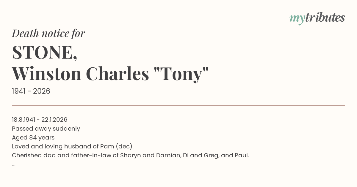 12°C18.8.1941 - 22.1.2026 Passed away suddenly Aged 84 years Loved and loving husband of Pam (dec). Cherished dad and father-in-law of Sharyn and Damian, Di and Greg, and Paul. Treasured pop to Brianna, Caitlin, Alec and Kirrily. Forever In Our Hearts