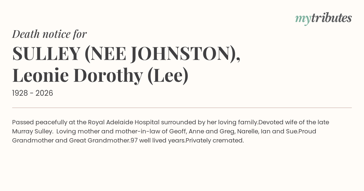 Devoted wife of the late Murray Sulley. Loving mother and mother-in-law of Geoff, Anne and Greg, Narelle, Ian and Sue.