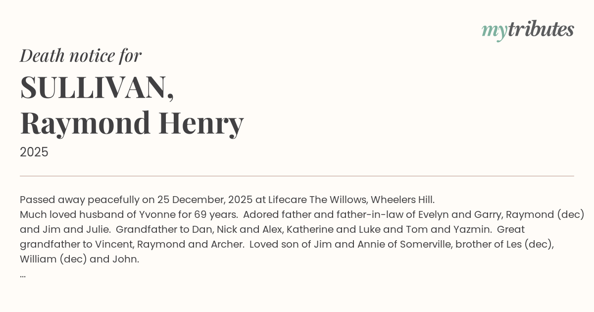 12°CPassed away peacefully on 25 December, 2025 at Lifecare The Willows, Wheelers Hill.