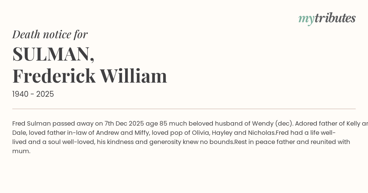 12°CFred Sulman passed away on 7th Dec 2025 age 85 much beloved husband of Wendy (dec). Adored father of Kelly and Dale, loved father in-law of Andrew and Miffy, loved pop of Olivia, Hayley and Nicholas.