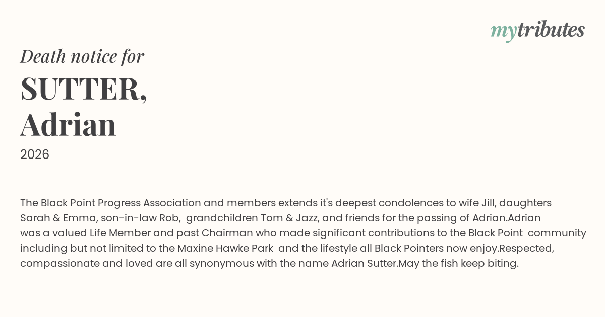 12°CThe Black Point Progress Association and members extends it's deepest condolences to wife Jill, daughters Sarah & Emma, son-in-law Rob, grandchildren Tom & Jazz, and friends for the passing of Adrian.