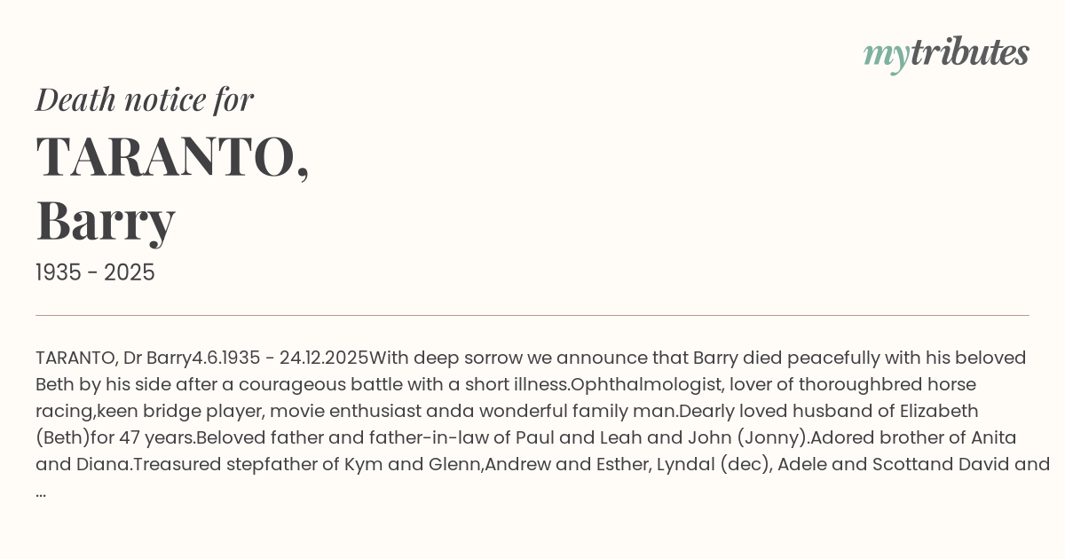 With deep sorrow we announce that Barry died peacefully with his beloved Beth by his side after a courageous battle with a short illness.