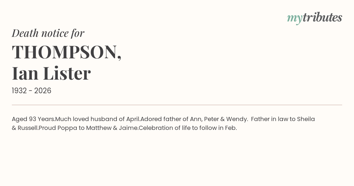 Adored father of Ann, Peter & Wendy. Father in law to Sheila & Russell.