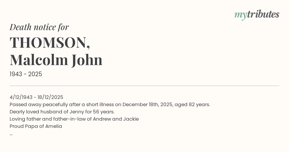Passed away peacefully after a short illness on December 18th, 2025, aged 82 years.