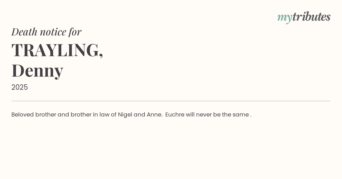 12°CBeloved brother and brother in law of Nigel and Anne. Euchre will never be the same .