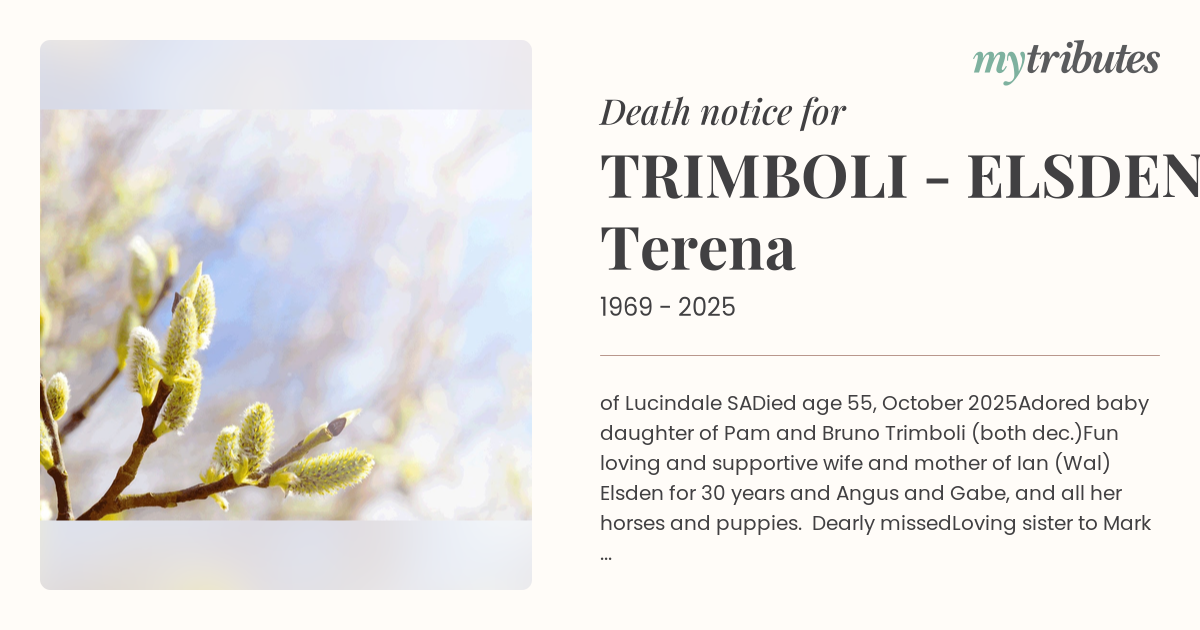 Loved daughter in law to Sandie and Wally Elsden (dec.); niece to Aunty Marg; sister in law and aunty to Michelle and Matt; Stacey, Maddie and Georgie; Paul, Sarah and Alfie.