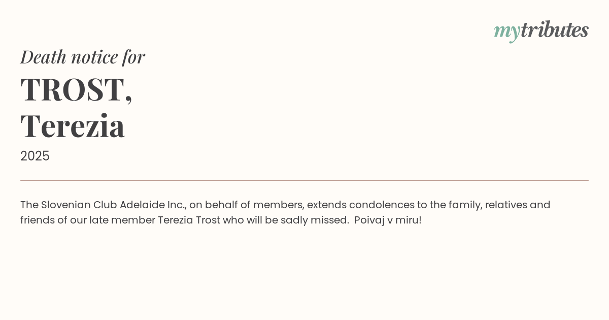 12°CThe Slovenian Club Adelaide Inc., on behalf of members, extends condolences to the family, relatives and friends of our late member Terezia Trost who will be sadly missed. Počivaj v miru!