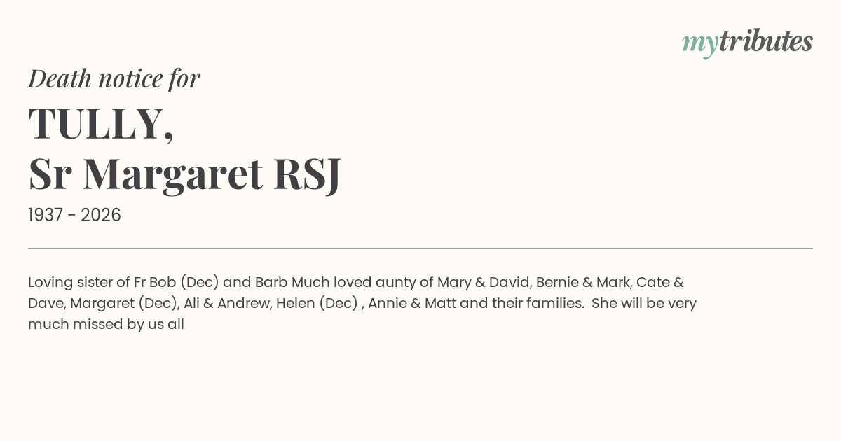 Much loved aunty of Mary & David, Bernie & Mark, Cate & Dave, Margaret (Dec), Ali & Andrew, Helen (Dec) , Annie & Matt and their families.
