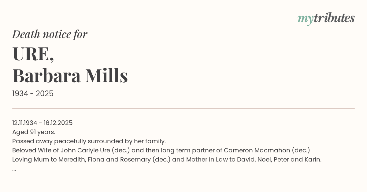 Beloved Wife of John Carlyle Ure (dec.) and then long term partner of Cameron Macmahon (dec.)