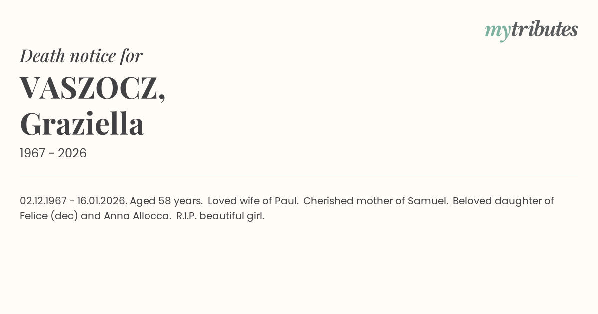 12°C02.12.1967 - 16.01.2026. Aged 58 years. Loved wife of Paul. Cherished mother of Samuel. Beloved daughter of Felice (dec) and Anna Allocca. R.I.P. beautiful girl.