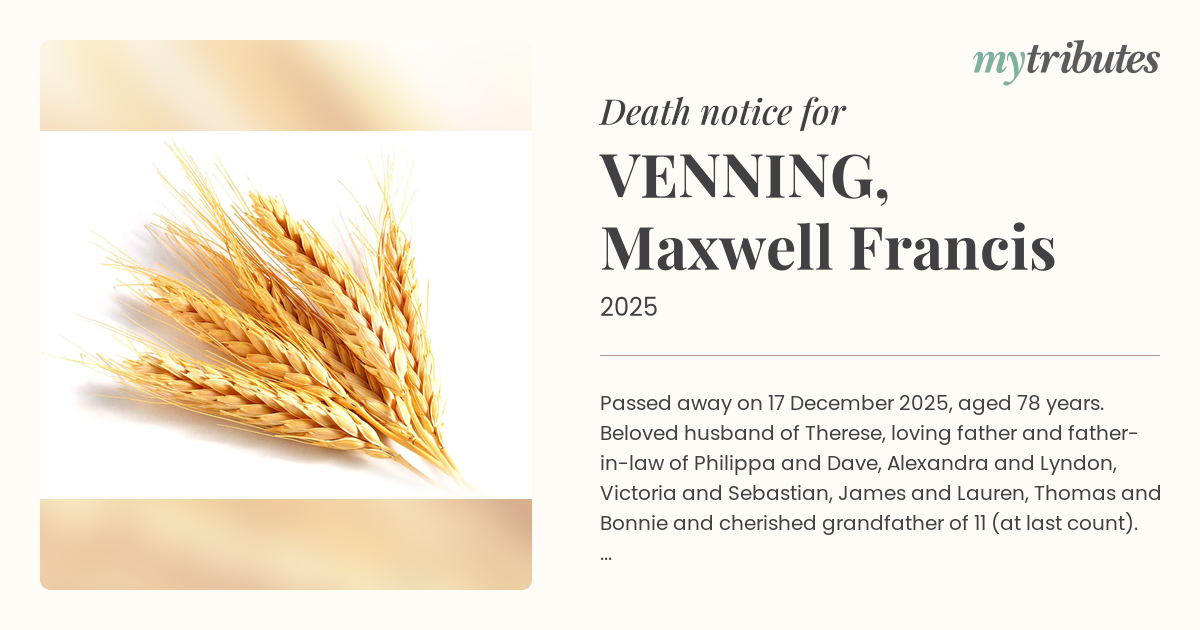 Beloved husband of Therese, loving father and father-in-law of Philippa and Dave, Alexandra and Lyndon, Victoria and Sebastian, James and Lauren, Thomas and Bonnie and cherished grandfather of 11 (at last count).