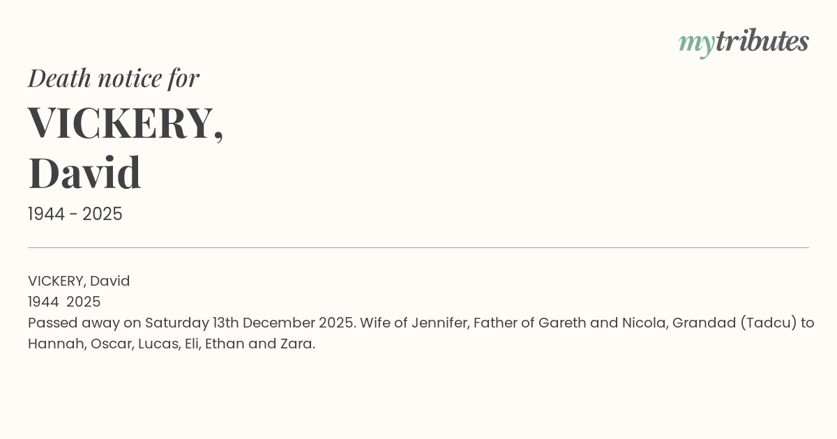 Passed away on Saturday 13th December 2025. Wife of Jennifer, Father of Gareth and Nicola, Grandad (Tadcu) to Hannah, Oscar, Lucas, Eli, Ethan and Zara.
