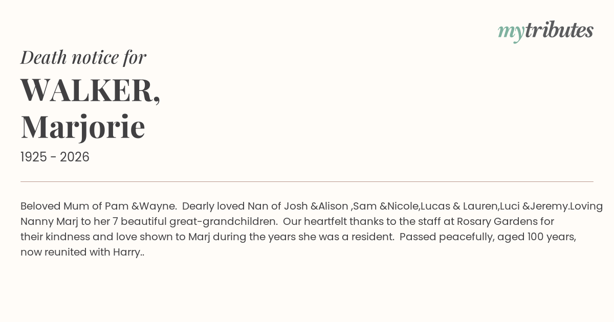 12°CBeloved Mum of Pam &Wayne. Dearly loved Nan of Josh &Alison ,Sam &Nicole,Lucas & Lauren,Luci &Jeremy.Loving Nanny Marj to her 7 beautiful great-grandchildren. Our heartfelt thanks to the staff at Rosary Gardens for their kindness and love shown to Marj during the years she was a resident. Passed peacefully, aged 100 years, now reunited with Harry..