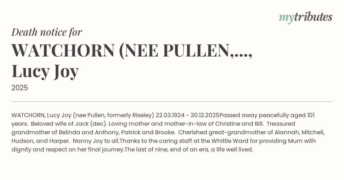 Passed away peacefully aged 101 years. Beloved wife of Jack (dec). Loving mother and mother-in-law of Christine and Bill. Treasured grandmother of Belinda and Anthony, Patrick and Brooke. Cherished great-grandmother of Alannah, Mitchell, Hudson, and Harper.