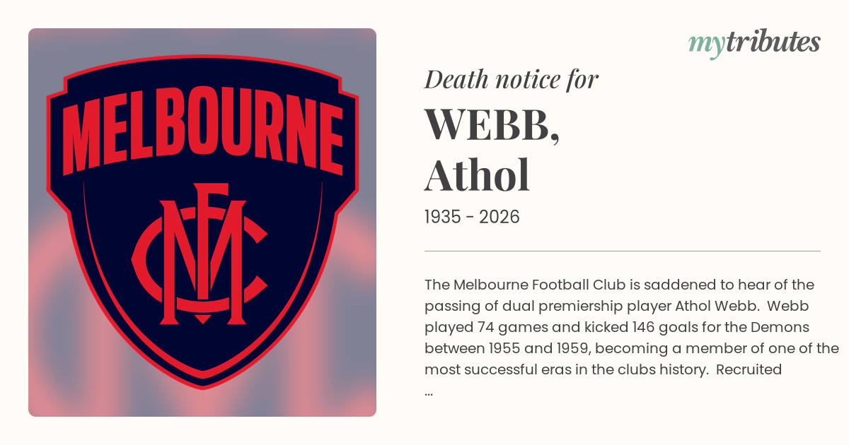 12°CThe Melbourne Football Club is saddened to hear of the passing of dual premiership player Athol Webb.