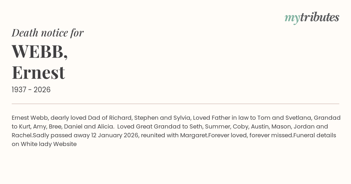 12°CErnest Webb, dearly loved Dad of Richard, Stephen and Sylvia, Loved Father in law to Tom and Svetlana, Grandad to Kurt, Amy, Bree, Daniel and Alicia. Loved Great Grandad to Seth, Summer, Coby, Austin, Mason, Jordan and Rachel.