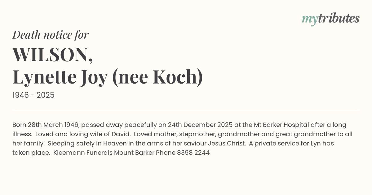 12°CBorn 28th March 1946, passed away peacefully on 24th December 2025 at the Mt Barker Hospital after a long illness. Loved and loving wife of David. Loved mother, stepmother, grandmother and great grandmother to all her family. “Sleeping safely in Heaven in the arms of her saviour Jesus Christ”. A private service for Lyn has taken place. Kleemann Funerals Mount Barker Phone 8398...