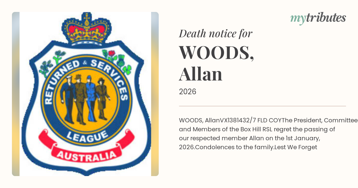The President, Committee and Members of the Box Hill RSL regret the passing of our respected member Allan on the 1st January, 2026.