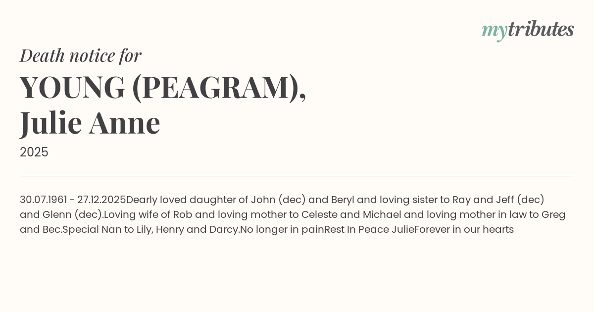 Dearly loved daughter of John (dec) and Beryl and loving sister to Ray and Jeff (dec) and Glenn (dec).