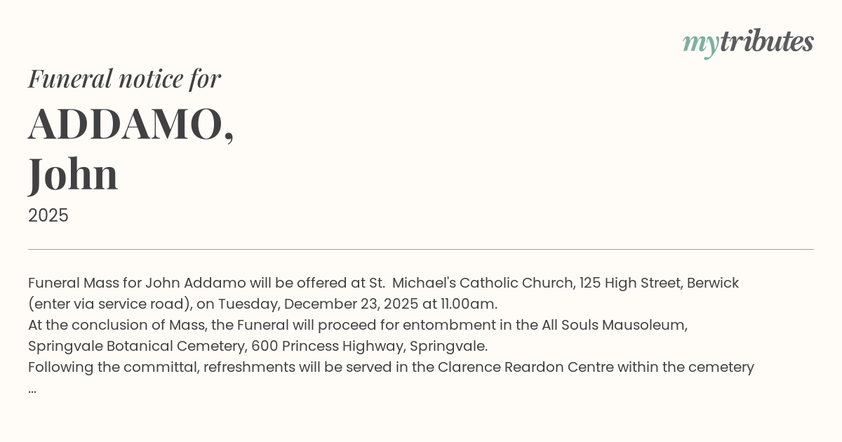 12°CFuneral Mass for John Addamo will be offered at St. Michael's Catholic Church, 125 High Street, Berwick