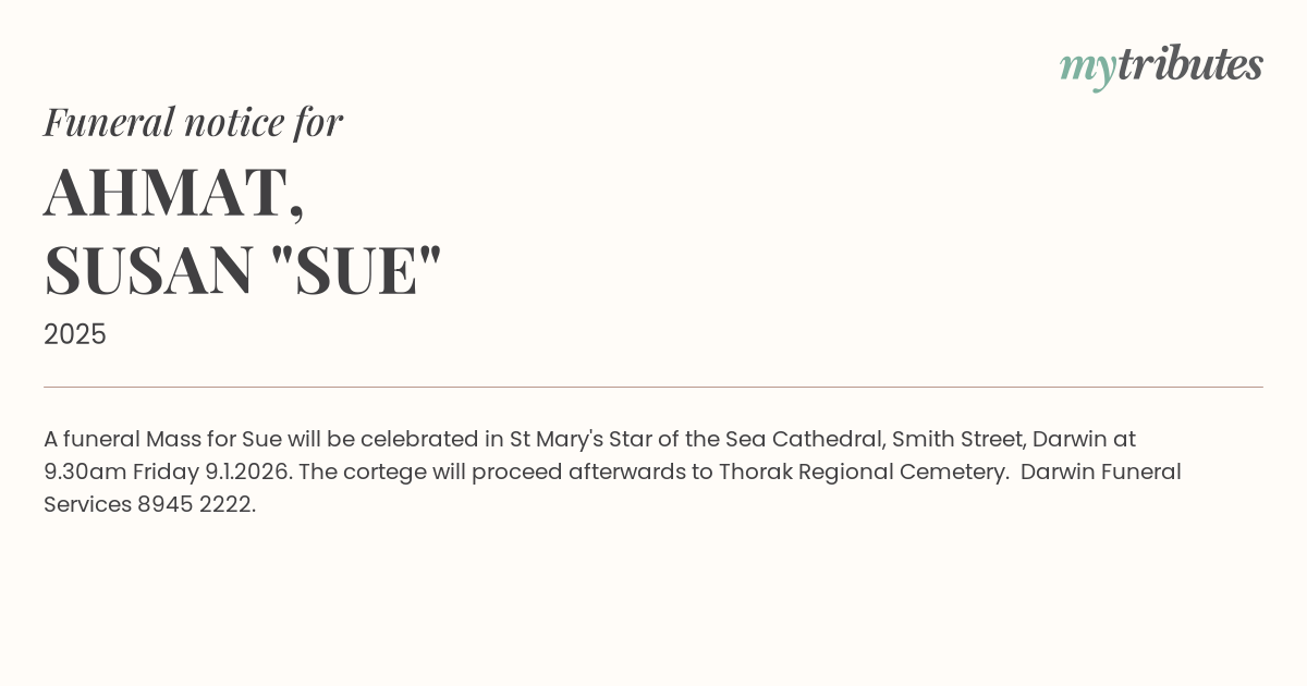 12°CA funeral Mass for Sue will be celebrated in St Mary's Star of the Sea Cathedral, Smith Street, Darwin at 9.30am Friday 9.1.2026. The cortege will proceed afterwards to Thorak Regional Cemetery. Darwin Funeral Services 8945... .